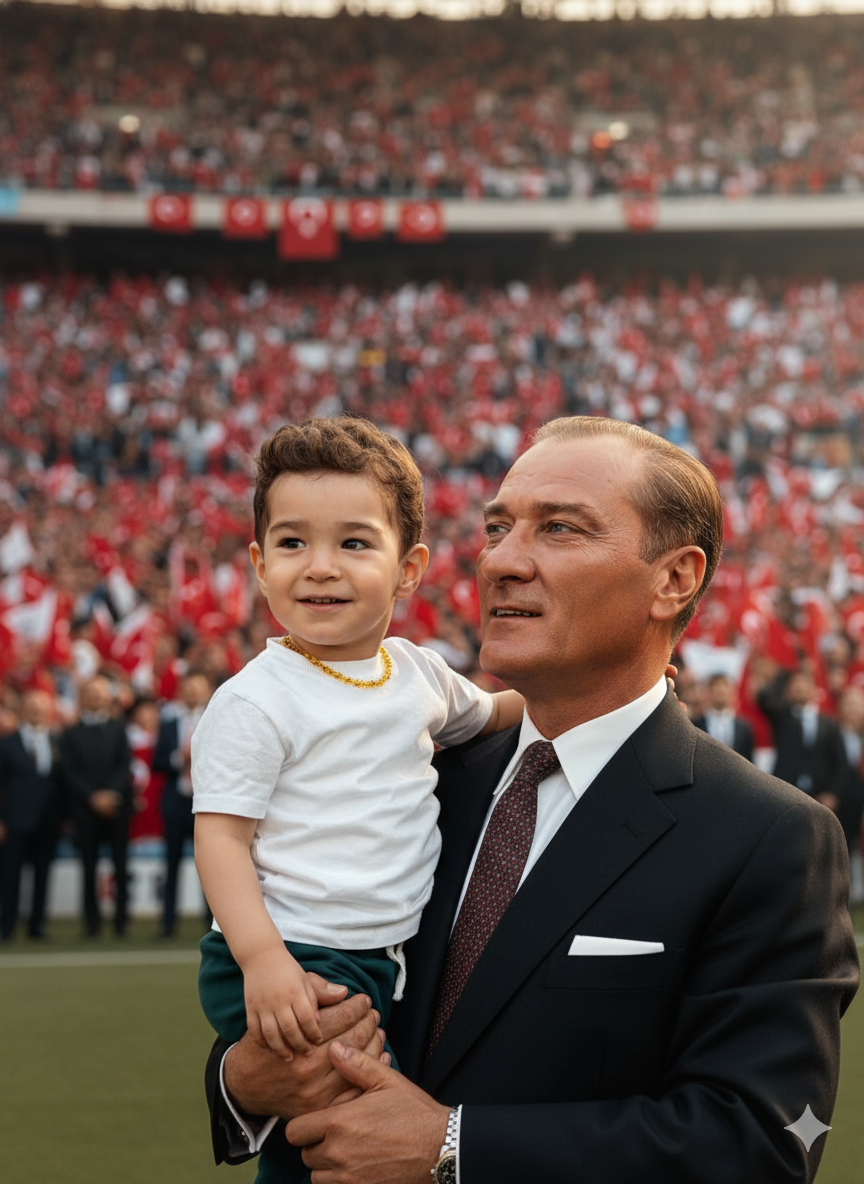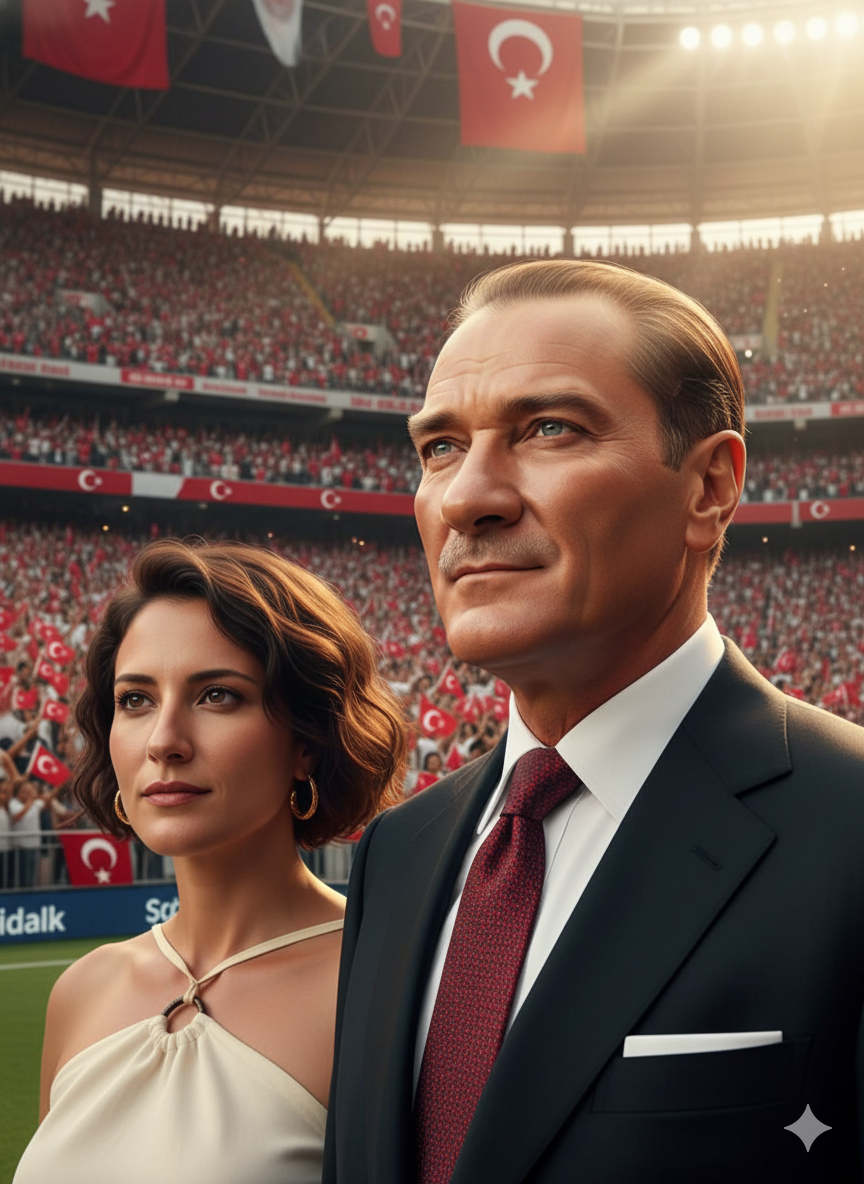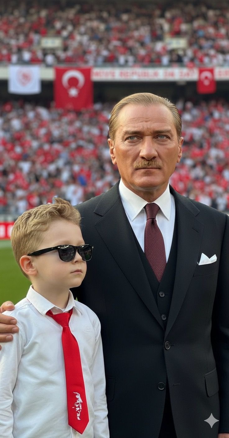 Hemen yanında, yüzünde sıcak bir tebessüm taşıyan Mustafa Kemal Atatürk bulunuyor.İkisi de yan yana duruyor ve ellerindeki Türk bayraklarını havada sallıyor.