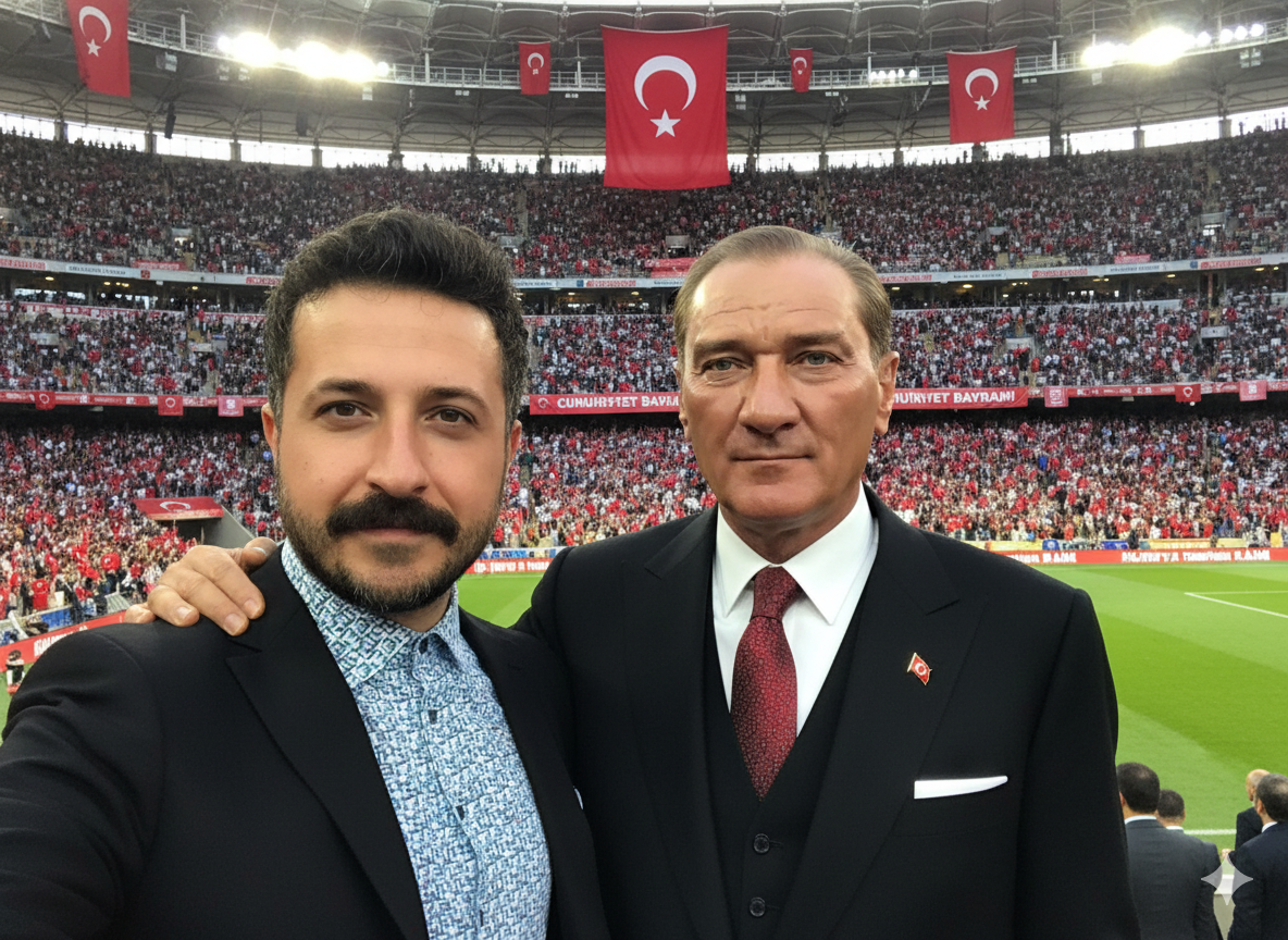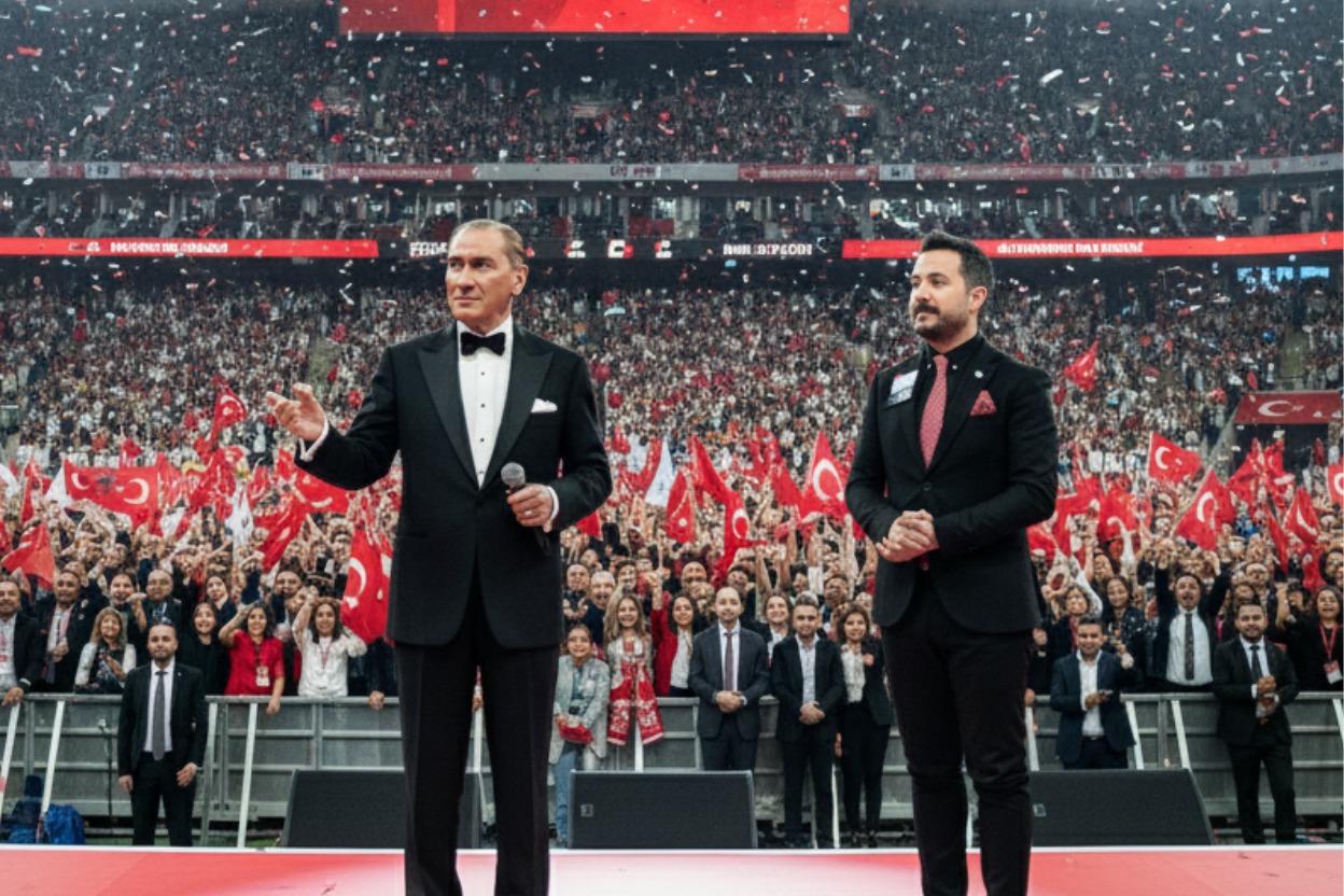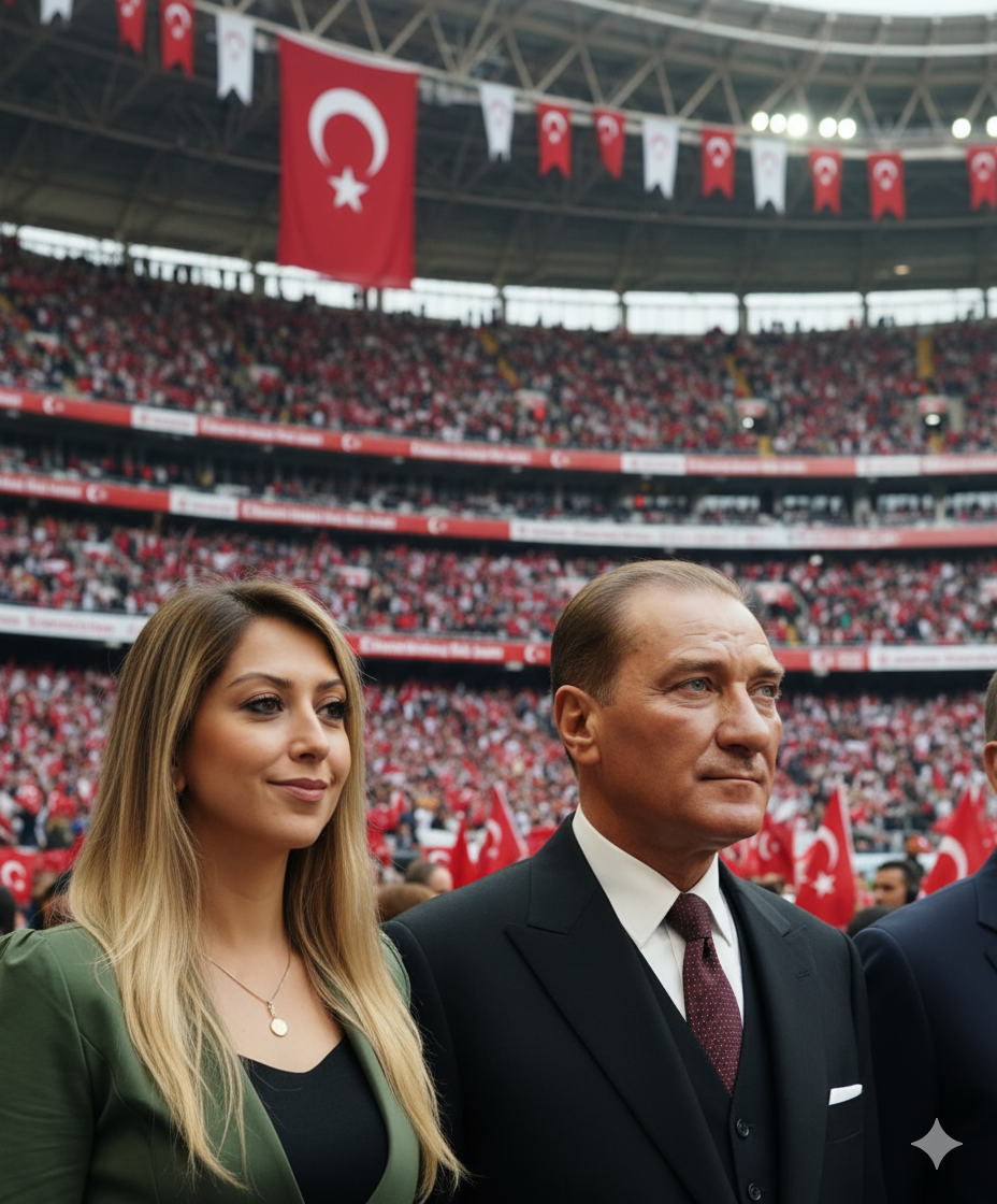 Ellerinde yalnızca bayraklar var; başka hiçbir aksesuar, rozet veya obje bulunmuyor.Arka planda geniş açıyla görünen coşkulu bir kalabalık var — insanların elinde Türk bayrakları ve gökyüzünde uçuşan kırmızı-beyaz konfetiler sahneyi tamamlıyor.