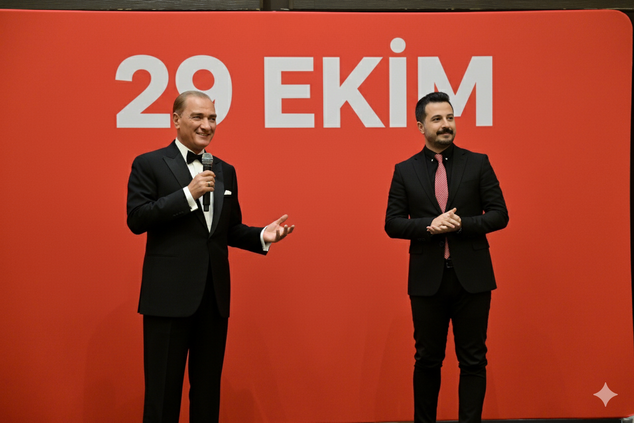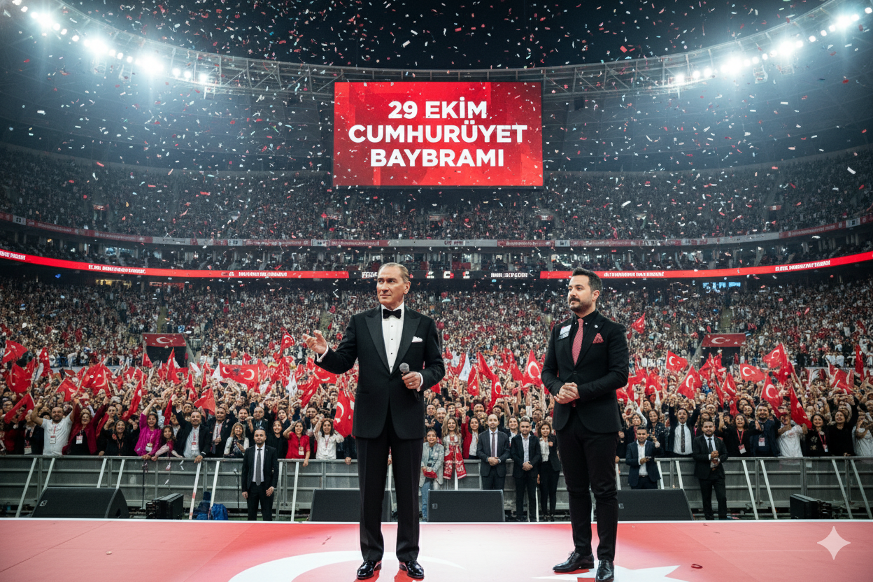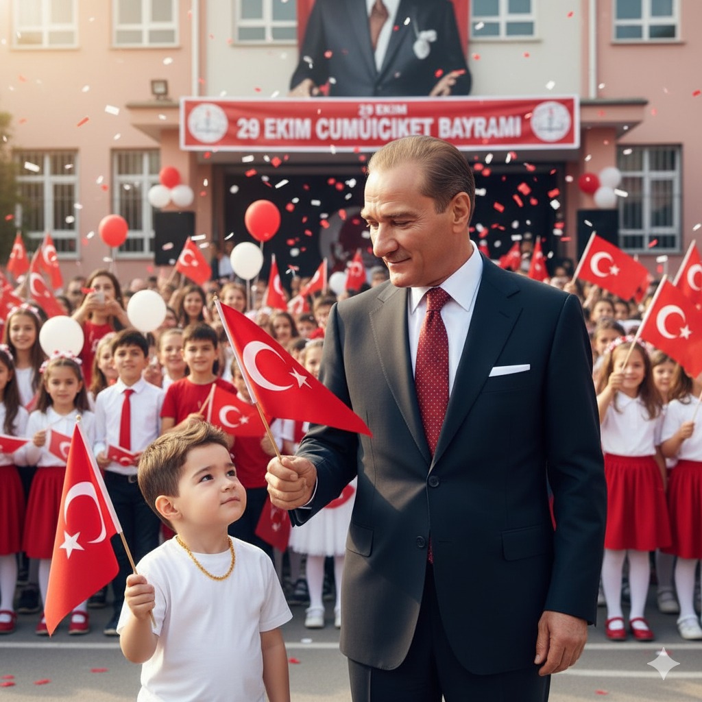 Sabah ışığında geçen, hiper-gerçekçi bir Cumhuriyet Bayramı kutlama sahnesi.