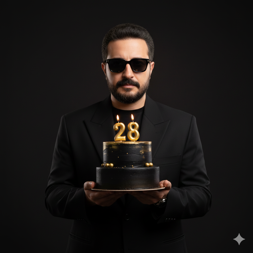 He is holding a birthday cake with lit candles forming the number “28”.