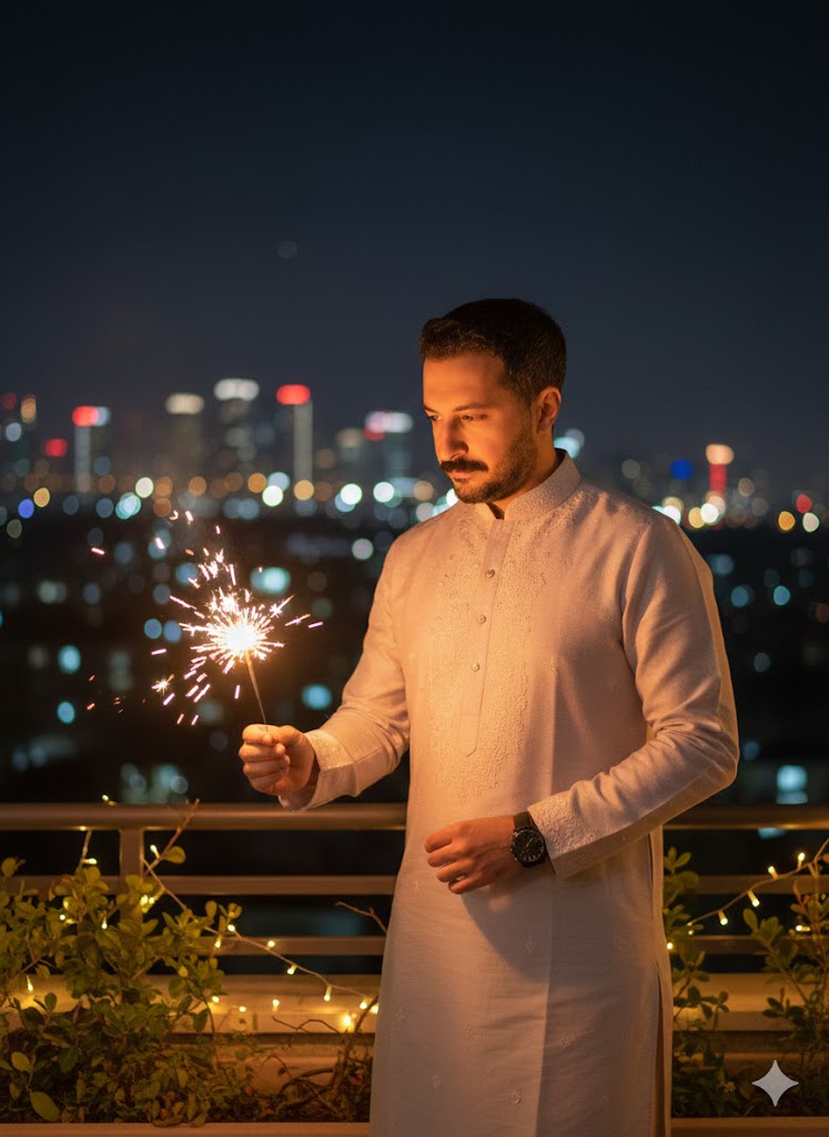 A young man wearing a pastel-colored kurta, standing on a balcony at night, holding a lit sparkler in his hand.