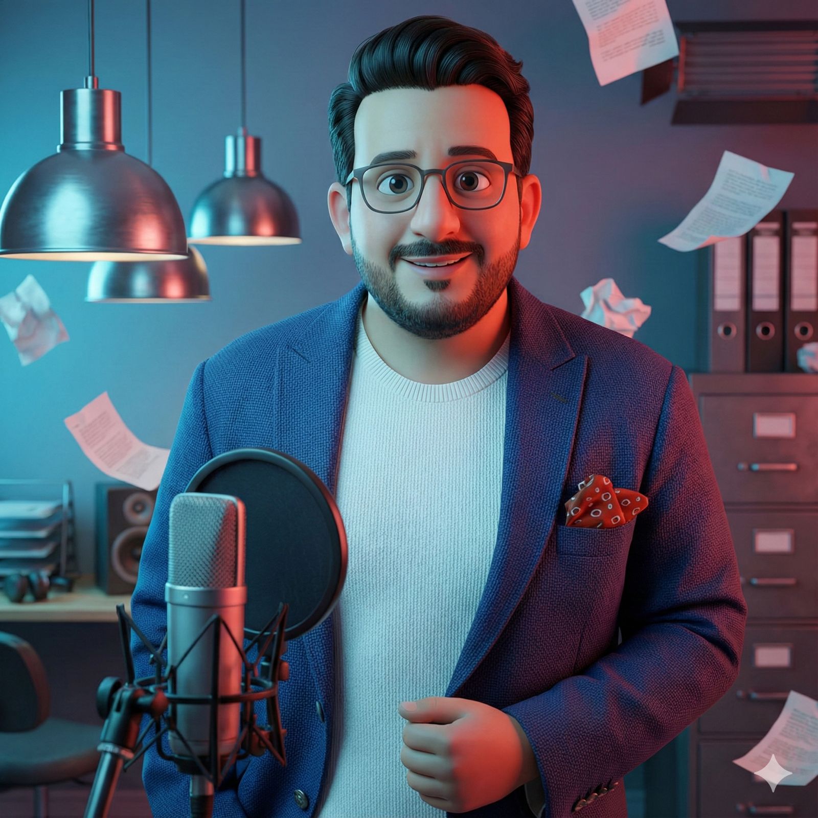 Generate a stylized 3D cartoon portrait of the person in the input image, while maintaining the exact studio scene and lighting setup from the reference image. The background must include floating crumpled papers, soft studio lighting with a neon blue and red bicolor scheme, metallic hanging lamp, file cabinets, and a recording microphone with pop filter in the foreground. The character should retain all facial features and attributes from the real input image - hair type, beard, glasses style, clothing texture, jewelry details (rings, chains), and overall skin tone — but rendered with stylized Pixar-level polish. Expression should show relaxed confidence, slightly tilted head, and calm eyes. Lighting must simulate dual tone: cool blue on one side, warm red on the other, with a soft fill to enhance texture depth. Render all elements with ultra high resolution and correct anatomy, preserving depth of field and realism of material surfaces (fabric, metal, skin). Final result must be immersive, cinematic, and faithful to the exact environment provided.