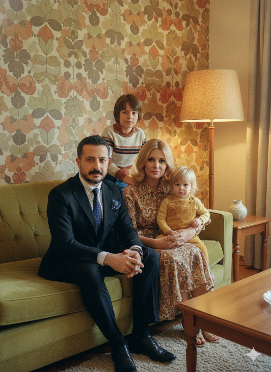 All subjects are posed together like a classic family photo, seated and standing naturally in a 1970s-style living room.