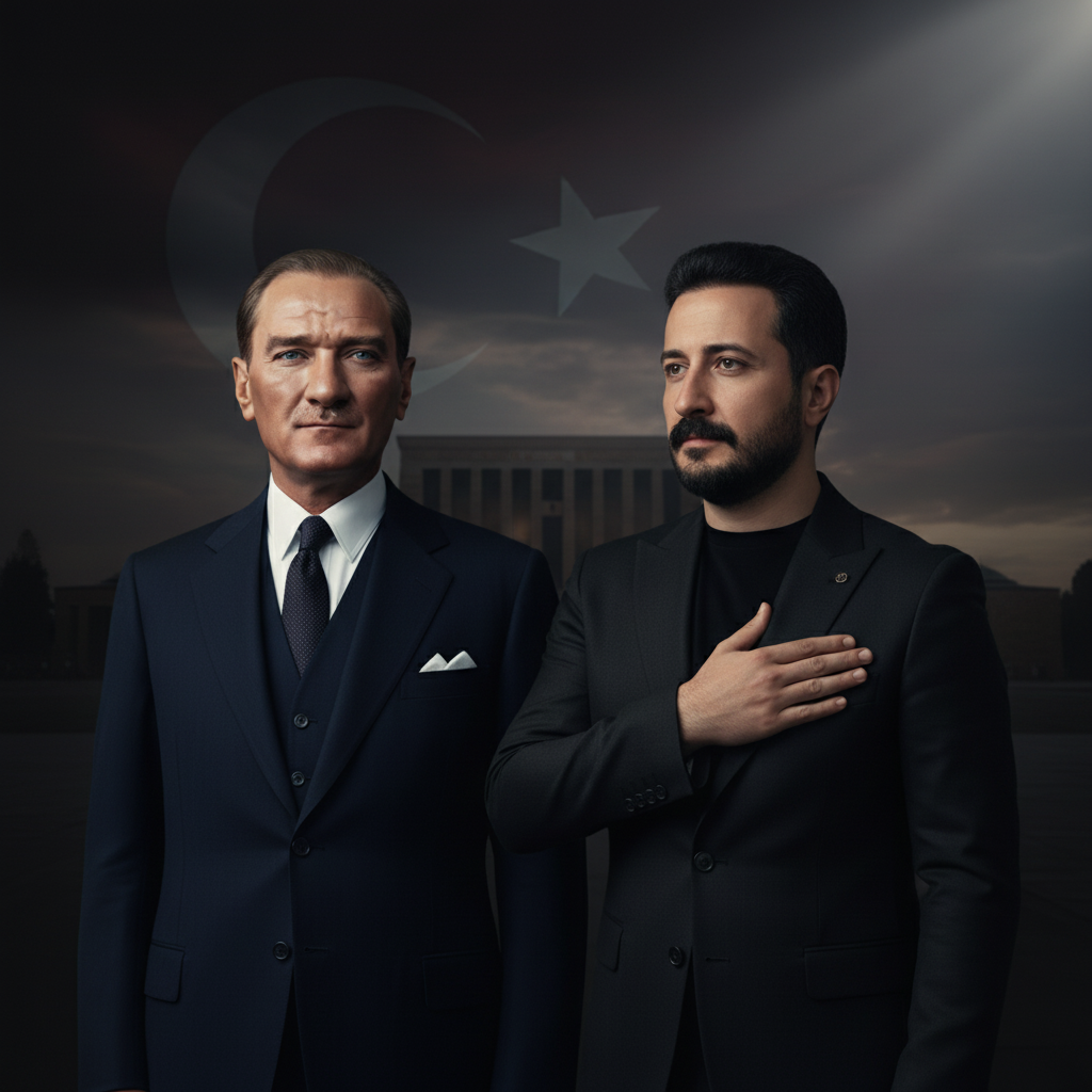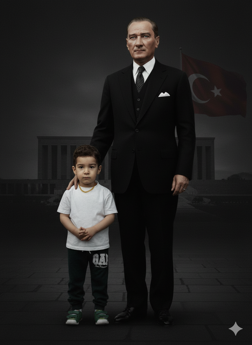 Create a solemn and respectful 10th of November memorial composition. Keep the original person's face, identity and presence clearly visible — their natural expression should remain calm and neutral, not exaggeratedly sad or emotional. The body posture, arms, and hand position may be gently adjusted to fit the scene, but the face must look authentic and natural. Add Mustafa Kemal Atatürk to the scene in a fully realistic way. Match his body orientation, posture, shoulder angle, head direction, and gaze to the person's pose so they appear naturally together. Respect real physical proportions: If the person is a child, Atatürk should appear taller, with a gentle, steady, respectful presence. Do not force equal height if it looks unnatural. Use dark, muted, mourning tones: deep blacks, charcoal shadows, soft subtle highlights. The atmosphere should feel quiet, respectful, and thoughtful — not dramatic or sorrow-heavy. Use low-key cinematic lighting: soft directional light on the faces with smooth, natural shadow gradients. Match light direction, contrast, color temperature and grain between both figures so they look photographed together. Background should be a very subtle, softly faded silhouette of Anıtkabir, or a dark, low-contrast Turkish flag, symbolic and respectful, without pulling attention. Expressions should remain calm, steady, composed, and gently reflective — no crying, no heavy sadness, no exaggerated grief. The final image should look like a real, quiet, dignified moment of remembrance: timeless, respectful, emotionally grounded, honoring the memory of Mustafa Kemal Atatürk on 10 November